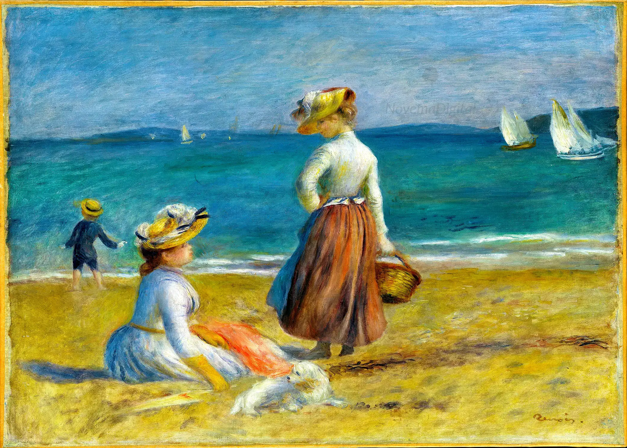 “Probably painted in 1890 on the Cote d’Azur in southern France, this sun-filled painting shows two female figures at the beach. The seated figure is shown in profile, her right hand holding a parasol on the sand. She exchanges a look with the standing figure to her right who holds a basket at her side. The women are joined by a small white dog, and before the water stands a young boy dressed in blue, seemingly throwing an object into the ocean. The standing figure serves as a vertical force which connects the horizontally banded foreground, water, and sky.