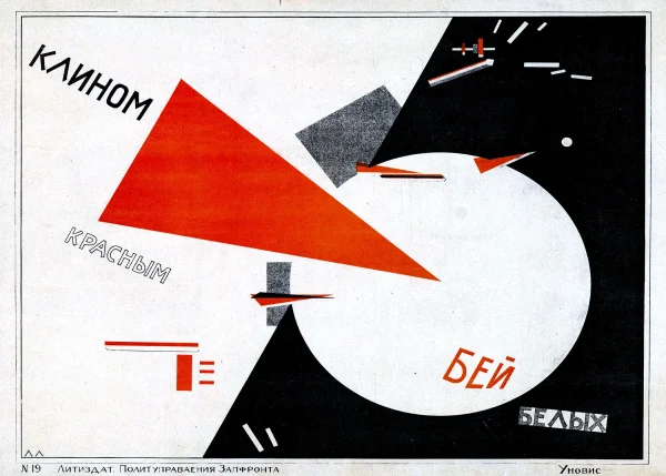 “Beat the Whites with the Red Wedge is a 1919 lithographic Bolshevik propaganda poster by El Lissitzky. In the poster, the intrusive red wedge symbolizes the Bolsheviks, who are penetrating and defeating their opponents, the White movement, during the Russian Civil War.”