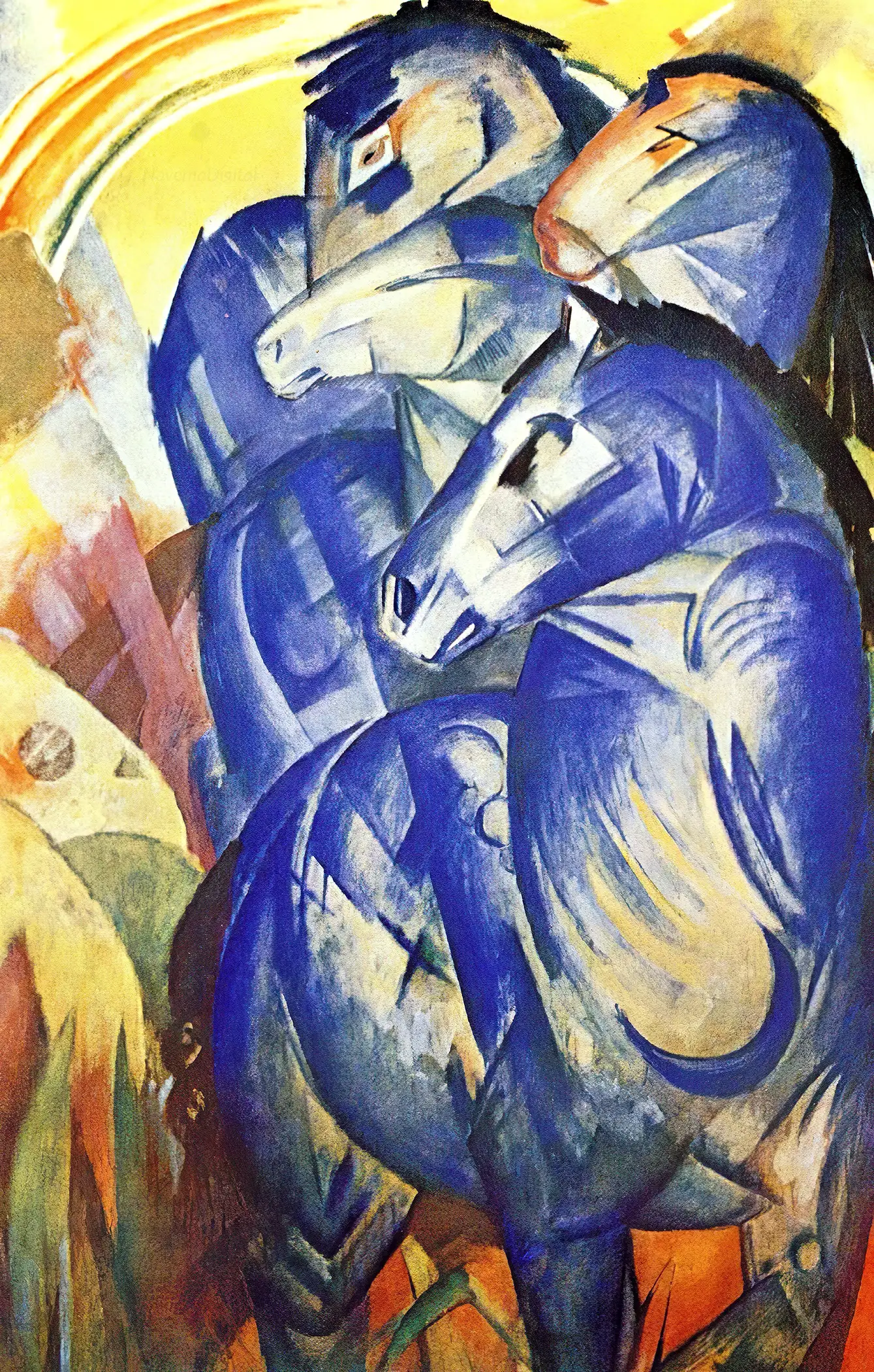 “Marc created the painting in summer 1913. A preliminary sketch in ink and gouache survives in the form of a new year’s postcard for that year to the poet Else Lasker-Schüler, one of 28 painted postcards which the artist sent to her and which she answered in illustrated letters later used in her novel Malik. The Blue Horses sketch uses her favourite colour, blue, and personal symbols of hers, the Moon and stars. This is now in the Munich State Graphics Collection. The large-format painting was one of seven works by Marc exhibited that autumn in the First German Autumn Salon (Erster Deutscher Herbstsalon).