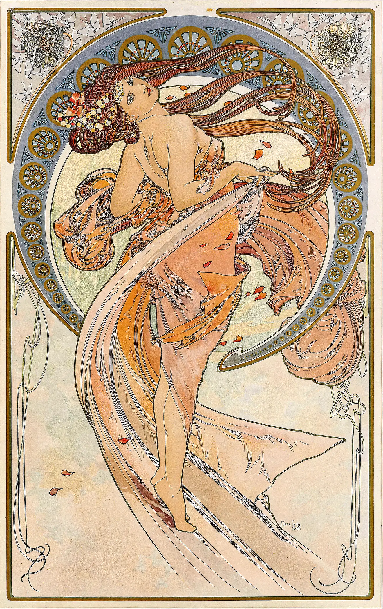 Mucha discarded traditional attributes such as musical instruments, paintbrushes and quills. Instead, he emphasised the creative inspiration of natural beauty by giving each of the arts a circular backdrop featuring a motif from nature indicating a particular time of day: for Dance falling leaves blown by a morning breeze; for Painting a red flower encircled by rainbows in fresh daylight; for Poetry the evening star shining in the sky at dusk; for Music the song of birds at moonrise.”