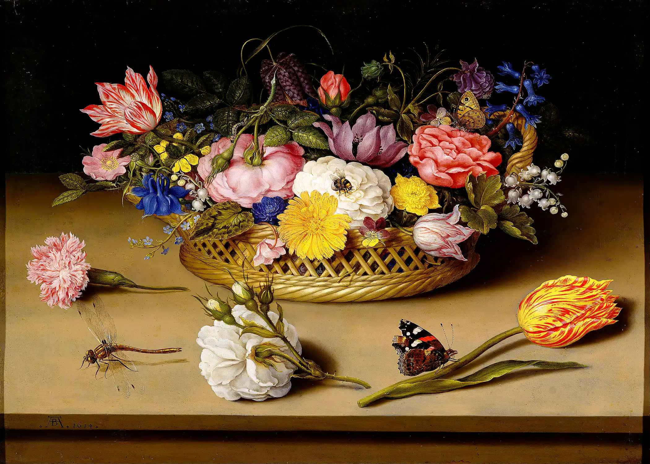 “A pink carnation, a white rose, and a yellow tulip with red stripes lie in front of a basket with flowers, that would not bloom together: roses, forget-me-nots, lilies-of-the-valley, a cyclamen, a violet, a hyacinth, and tulips. Insects, short-lived like flowers, remind of the brevity of life and the transience of its beauty.”