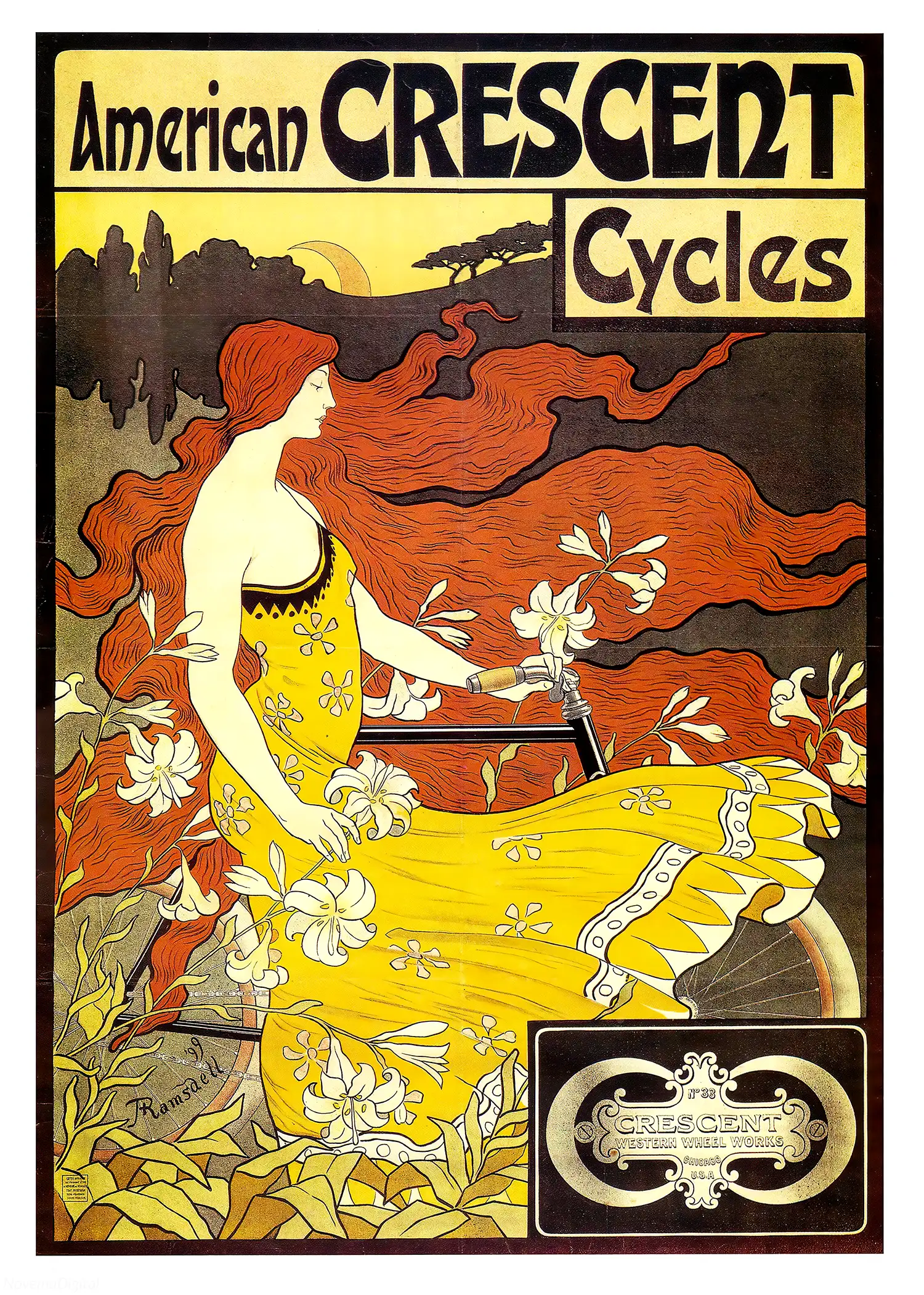 “Vintage Art Nouveau poster for the American Crescent Cycle company illustrated by Frederick Winthrop Ramsdell in 1899.”
