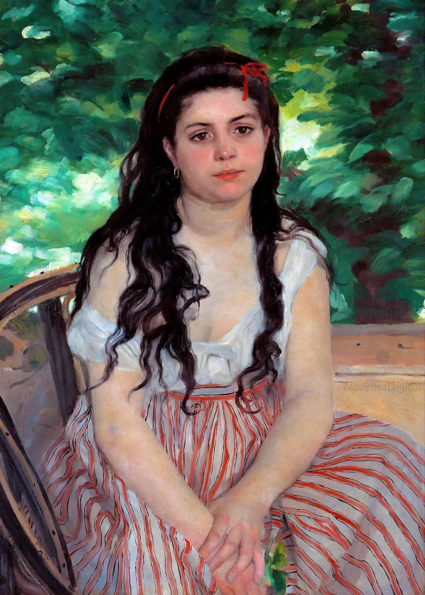 The painting measures is a half-length frontal portrait of a young woman, dressed informally, sitting on a chair beside a wall, possibly on a balcony, with greenery behind. The female figure is carefully finished, but the background is sketched out roughly with bold dashes of colour in broad brushstrokes suggesting sunlit foliage. A thin red hairband pulls her hair back from her face, with dark wavy tresses falling loosely over her shoulders and white bodice. The right strap of the bodice has fallen off her shoulder, creating a very deep neckline. She has a distant expression, gazing to the right of the viewer. Her bare arms lie in her lap, resting on a skirt with red and white stripes, with a few green leaves held in her right hand. The painting is signed “A. Renoir” on part of the chair to the lower left.