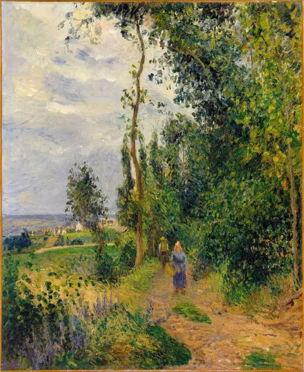 “The patch of purple flowers at the lower left adds a sprightly note to this canvas, which probably dates to the spring of 1878. Featuring strollers on a path, it is typical of Pissarro’s views of Pontoise and its surroundings, almost all of which show the peasants who worked the land or lived in the village.