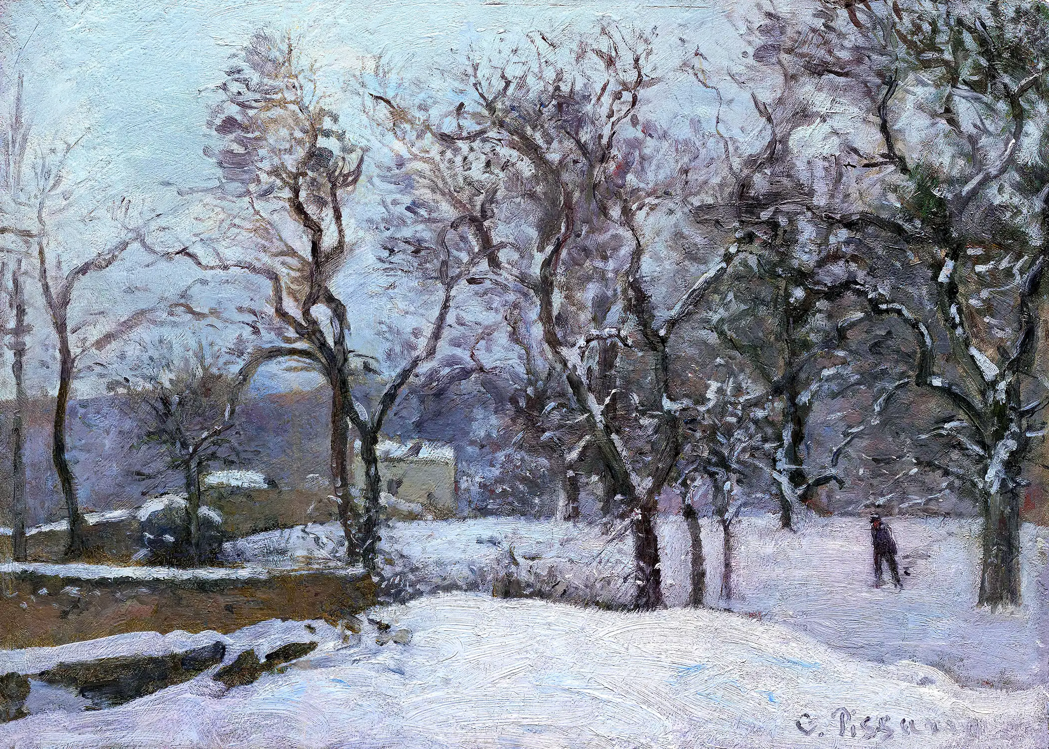 “Camille Pissarro made this small oil on panel painting showing trees and houses blanketed by a heavy snow at Louveciennes, the village west of Paris where he lived. Using a limited palette of shades of white, brown, blue, tan, gray, and green to evoke the gray skies and freshly fallen snow of a cold winter day, Pissarro created a scene that has the freshness and spontaneity of a work painted outdoors.
