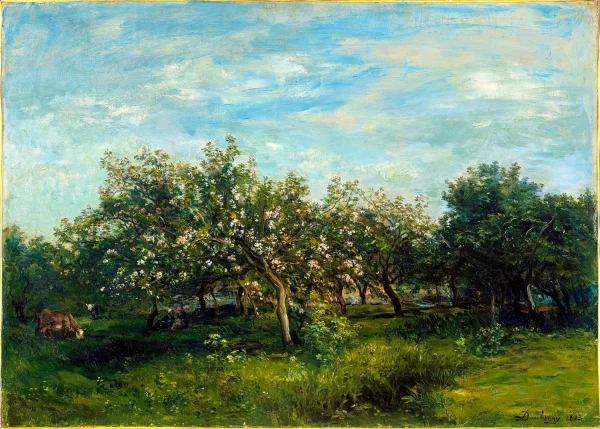“Critic Théophile Gautier extolled Daubigny’s landscapes as “pieces of nature cut out and set into golden frames.” The artist first painted flowering orchards about 1857, reprising the motif almost every spring. His unpretentious subject matter, rendered with rapid, summary brushstrokes, soon earned the admiration of younger colleagues like Monet.