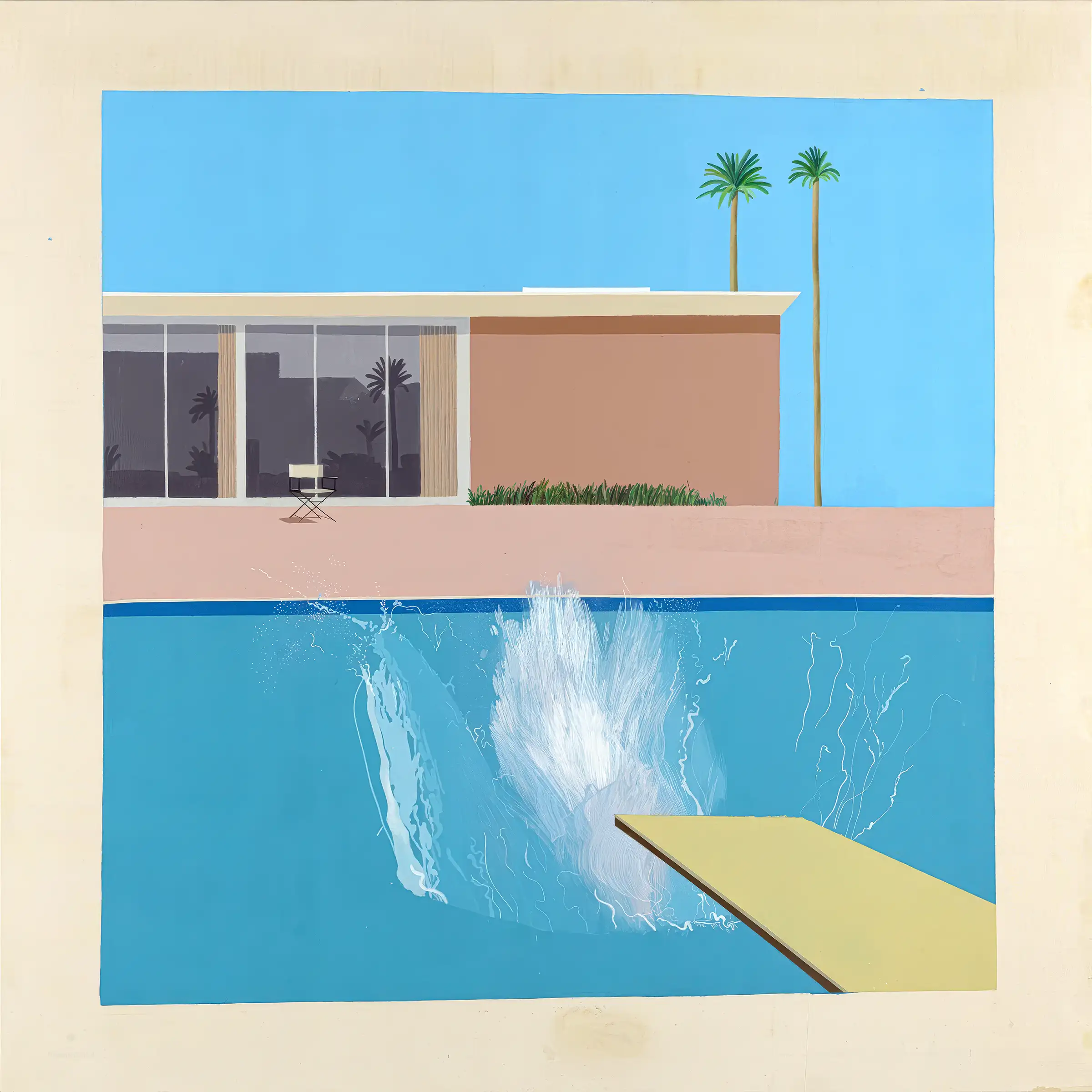 “A Bigger Splash shows a typical California day – warm and sunny, with a cloudless blue sky. In the background, two palm trees loom over a large single-story house, with flat roof and large sliding glass doors, in front of which an empty director’s chair with thin crossed legs stands on a wide pink patio. A shadow under the chair suggests that the sun is high in the sky, around noon. In the foreground, a yellow diving board slants away from lower right corner, leading the viewer’s gaze towards the centre of a large swimming pool, where water fountains into the air, capturing the moment right after someone has dived in. The diver is not visible, presumably still under the water. The chair lies further back along the same diagonal line. A thickening in the white line atop the building’s flat roof emphasizes the place where the diver has entered the water.