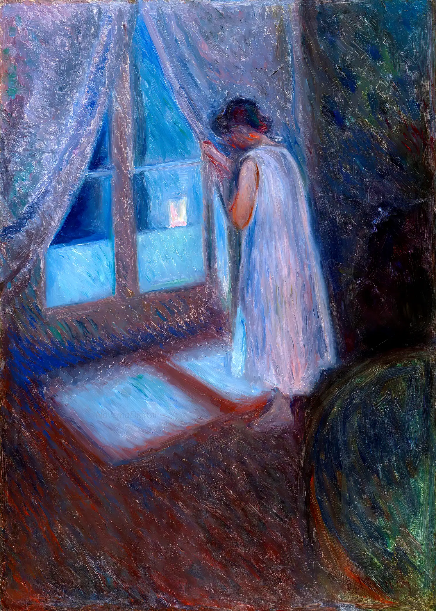 In the dead of night, a young girl in her nightgown stands in a darkened room gazing out at the city. The steep angle of the floor and the deep shadows that obliterate everything in the room, save a suggestion of a piece of furniture at the lower right, create an unsettling and enigmatic scene. Loosely applied, somber brown tones mingle with violets and blues, evoking a feeling of melancholy and anticipation. The window functions as a symbolic barrier, separating the interior from the outside world. The sense of mystery is deepened and complicated by the fact that we cannot see the expression on the girl’s face, nor do we know what she covertly observes. She in turn appears unaware that, as she gazes from behind the curtain at something unknown outside, the artist and implied viewer are watching her.”