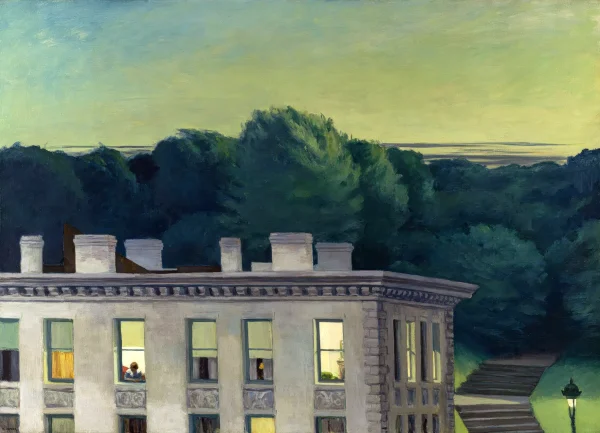 The viewers can sense looming darkness that is going to dominate over the light, creating a feeling of suspense. In addition, Hopper’s attention to the details of the buildings shows his enthusiasm for architecture and its interaction with nature and the cityscape.”