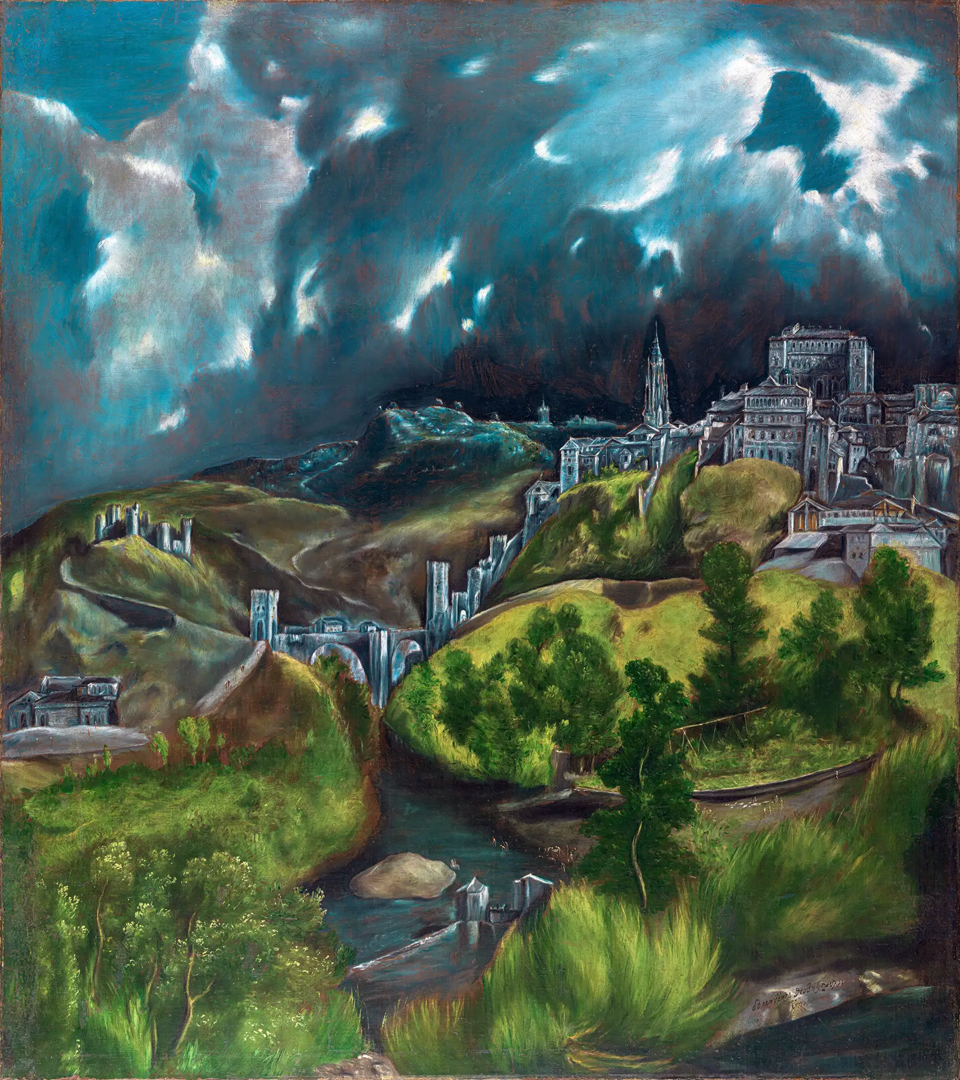 Regarded as El Greco’s greatest landscape, it portrays Toledo, the city where he lived and worked for most of his life. But it is an emotive rather than a documentary vision that not only imaginatively revises the skyline—most notably, the cathedral has been moved—but also distorts architecture and landscape such that they are fully in service of the kind of drama Rilke and other modernists appreciated in his work.”