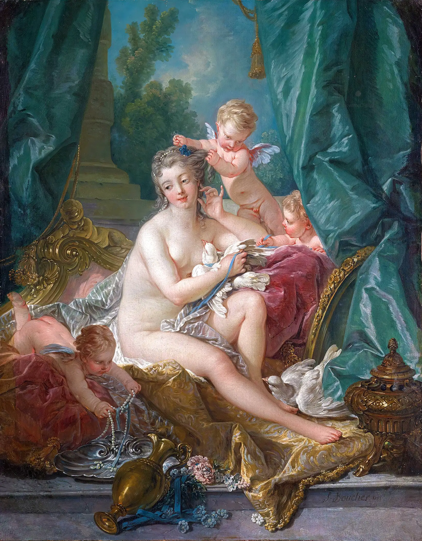 Boucher’s depiction of the goddess of love adorning herself with the help of putti encapsulates key features associated with this movement: overt theatricality, voluptuous flesh, and an asymmetrical unfurling of luxurious furniture, fabric, flowers, and pearls.”
