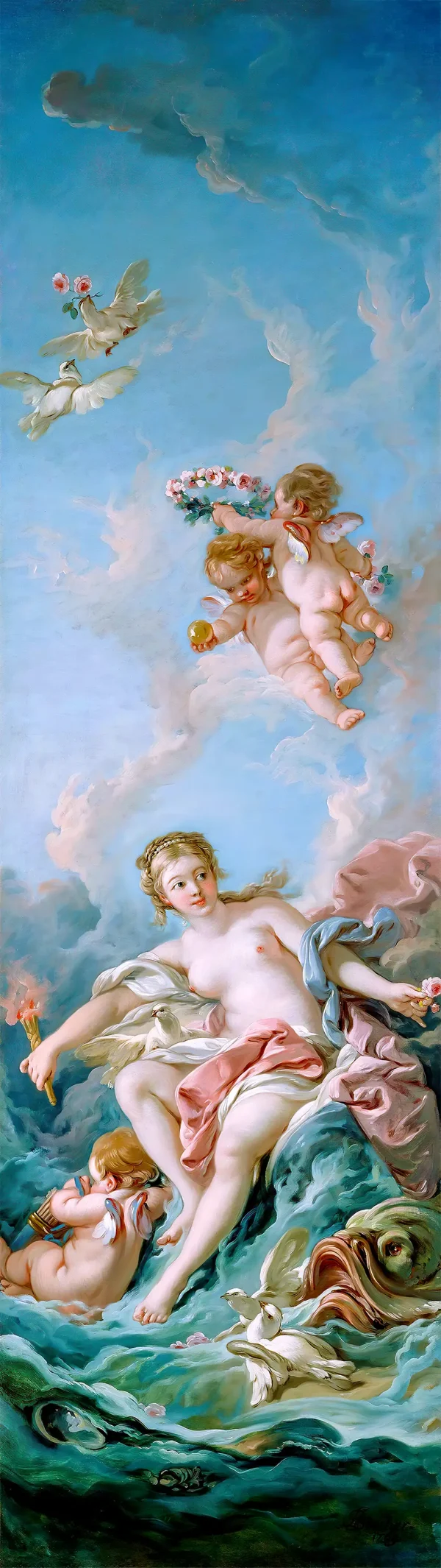 “François Boucher depicted a mythological world of delicate sensuality and indolence. Putti and doves attend Venus, the goddess of love, as she lounges amid a luxurious heap of drapery, while an elaborately decorative sky occupies the upper half of the painting. The artist used a pastel palette of blues, pinks, mauves, and peach tones and loose, rapid brushstrokes more characteristic of his tapestry designs than of his finished oil paintings.