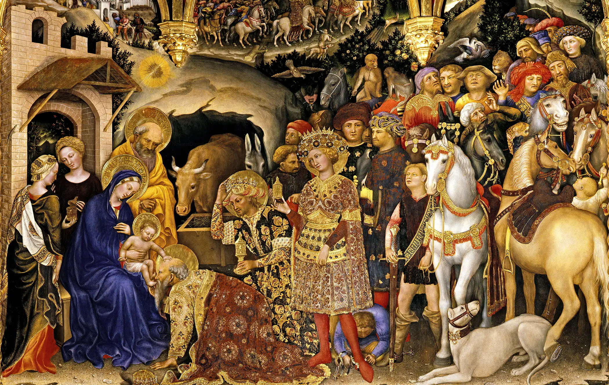 “The Adoration of the Magi is a painting by the Italian painter Gentile da Fabriano. The work, housed in the Uffizi Gallery in Florence, Italy, is considered his finest work, and has been described as “the culminating work of International Gothic painting”.