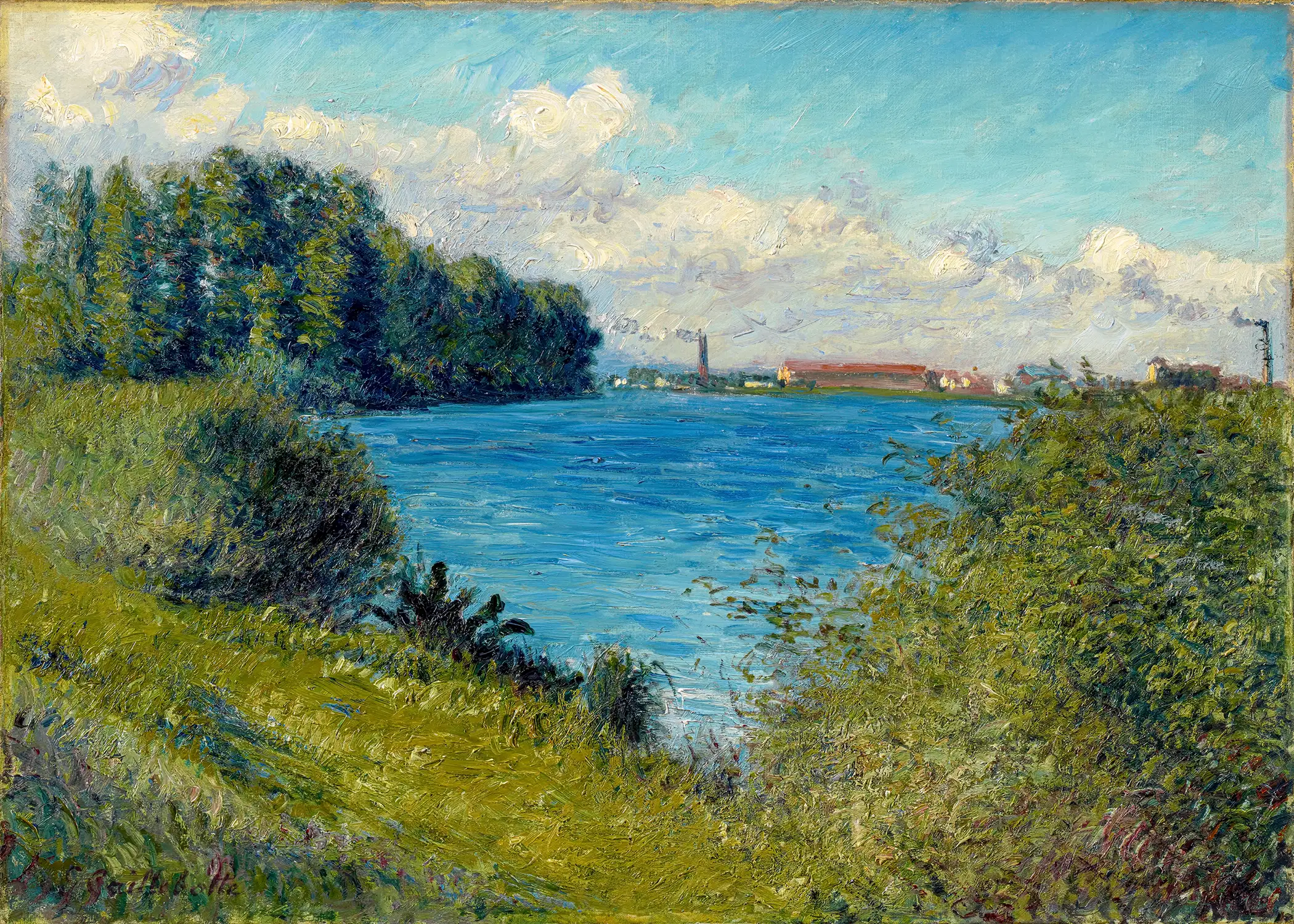 Caillebotte’s technique is richly varied—the grassy riverbank that dominates the foreground is thickly painted, while the sky and water are described with thin, fluid strokes of the artist’s brush.”
