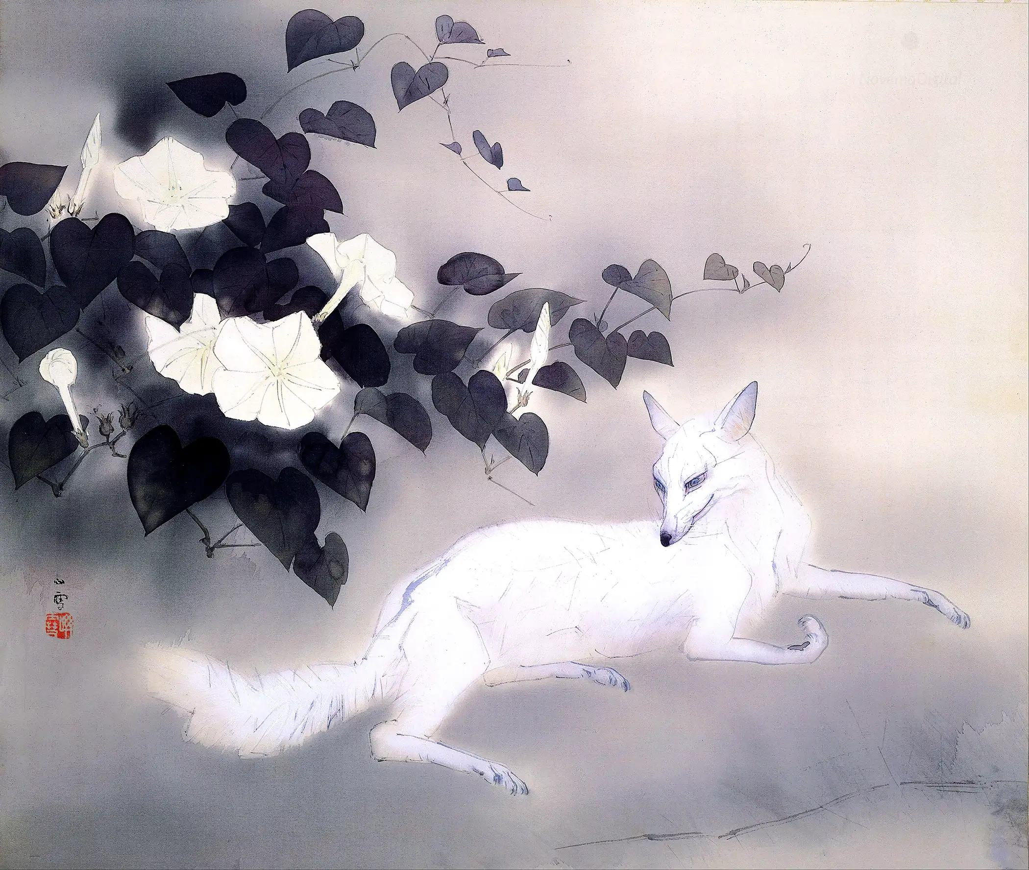 “A white fox is sitting under moonflowers on a warm summer evening. The picture is humid, intimating that this scene takes place after an evening shower. The combination of moonflowers and the fox is exquisite. Their whiteness glimmers in the darkness and it reeks of the coolness of summer. The flowers are soft and cottony, and the fox is cool and clear. Kansetsu began painting animals in the Showa era.