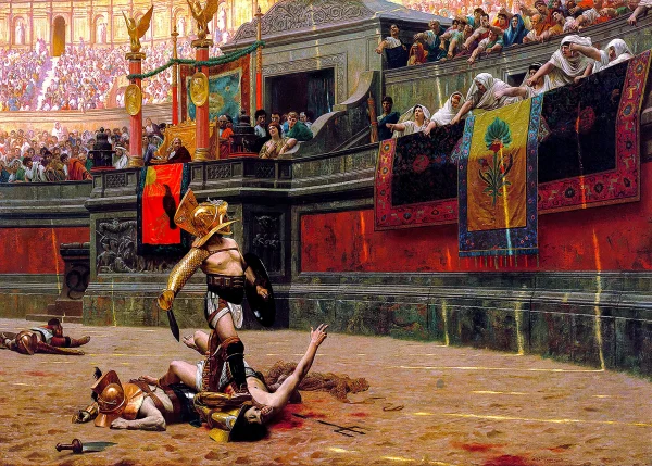 The thumbs-down gesture in the painting is given by spectators at the Colosseum, including the Vestals, to the victorious murmillo, while the defeated retiarius raises two fingers to plead for mercy. The painting was an inspiration for the 2000 film Gladiator, where Commodus holds out a raised thumb to spare the film’s hero, Maximus.