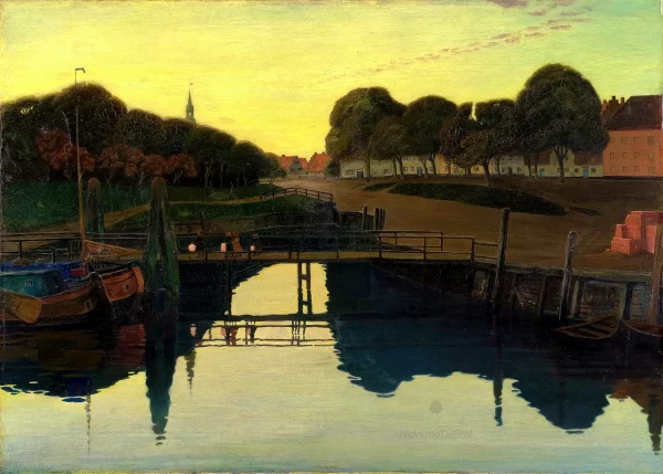 “During a visit to France, Johan Rohde became acquainted with several leading French artists. He returned to Copenhagen with these impressions and there he became an important source of inspiration for his fellow-artists. His Summer Night at Tønning is a good example of how he transformed reality into a dreamlike idyll – for instance by synthesising the scene, in other words “polishing” each individual element into shape and allowing them to form an effective whole.”