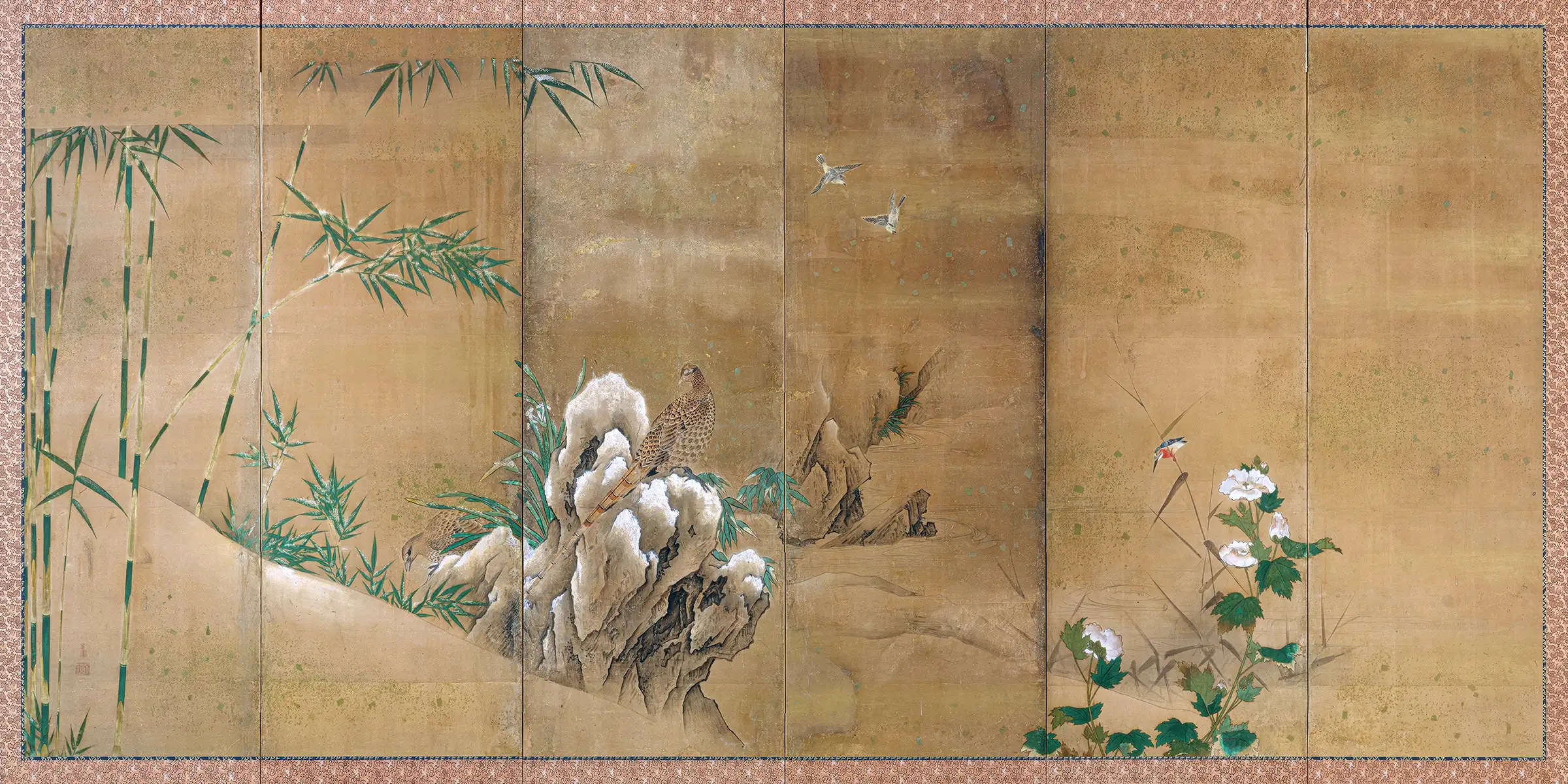 “The right-hand screen features plum blossoms with other spring flowers growing nearby; farther to the left, the irises of summer are in bloom. Nightingales and cuckoos celebrate both seasons. The left-hand screen depicts autumn and winter, represented by hibiscus, snowy bamboo, a kingfisher, and pheasants. Each screen bears two seals of Kano Sanboku.