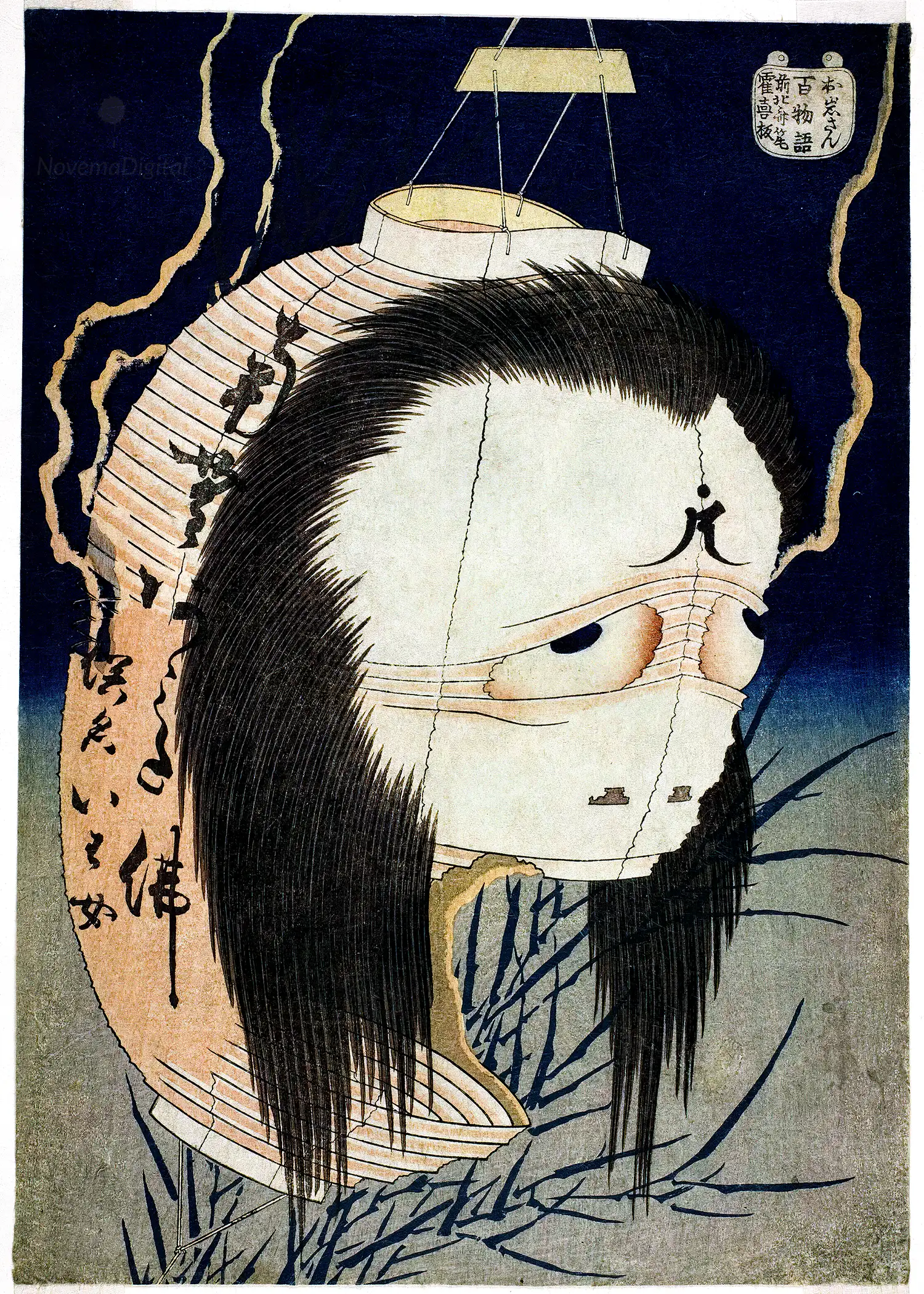Paper lanterns were used in the Buddhist tradition mukae-bon, the beginning of Obon; people bring them to their family member’s graves to welcome their spirits. In Hokusai’s print ghost of Oiwa possessed a lantern, in accord with a belief of the lantern usage for communication with ancestral spirits. On the lantern there is an inscription: “Praise Amida / The Woman Named O-iwa”. The calligraphy is written in choshin style, which is not typical of that used for paper lanterns. Kassandra Diaz writes that: