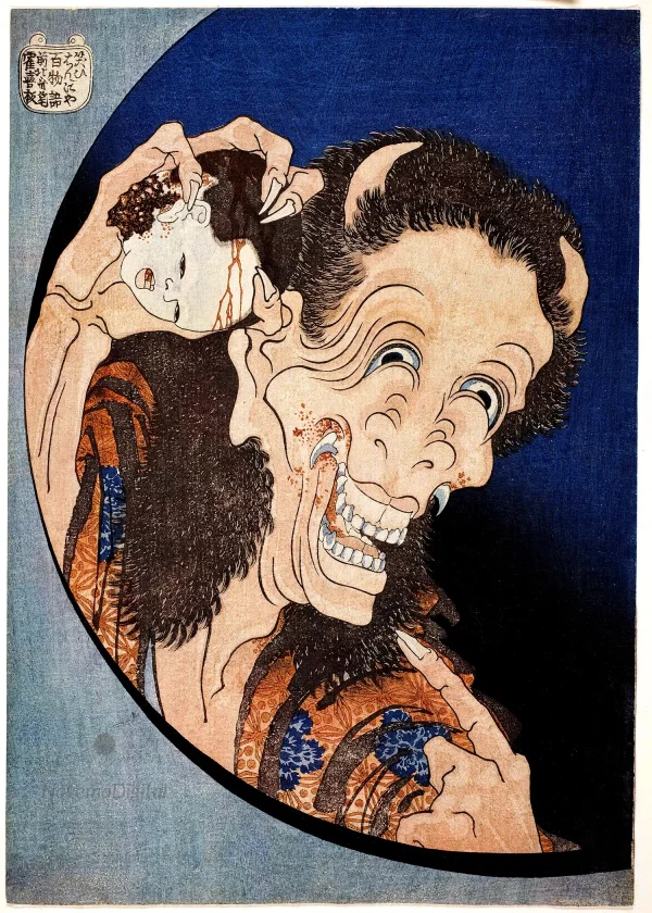 “In this print Hokusai combined two folklore monsters; a Hannya, an old woman was believed to be changed into a demon because of deep-seated jealousy, and a Yamanba (“mountain woman”), a demon believed to devour kidnapped children. The print shows the monster reveling in her demonic meal of a live infant. The story is from the Nagano region’s folklore. Warai-Hannya was also called the Laughing Demoness or Ogress.
