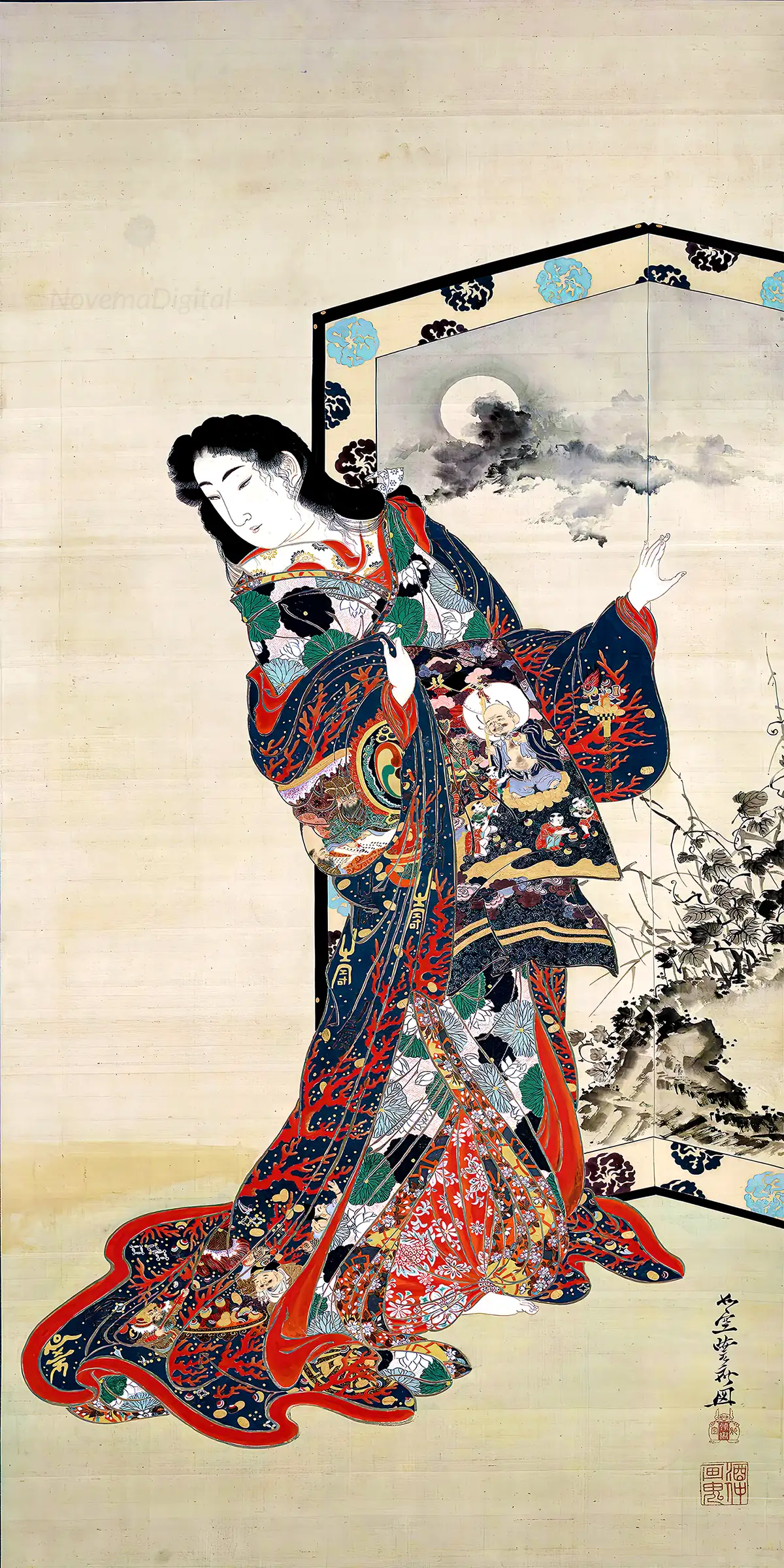 In addition to his caricatures, Kyōsai painted a large number of pictures and sketches, often choosing subjects from the folklore of his country, Nô drama, nature and religion, for example The Temptation of Shaka Niorai or The goddess Kwannon on a dragon (on kakejiku frame) A fine collection of these works is preserved in the British Museum; and there are also good examples in the National Art Library at South Kensington and the Guimet Museum at Paris. The Kawanabe Kyōsai Memorial Museum was established in 1977, located at Warabi, Saitama Prefecture, Japan.