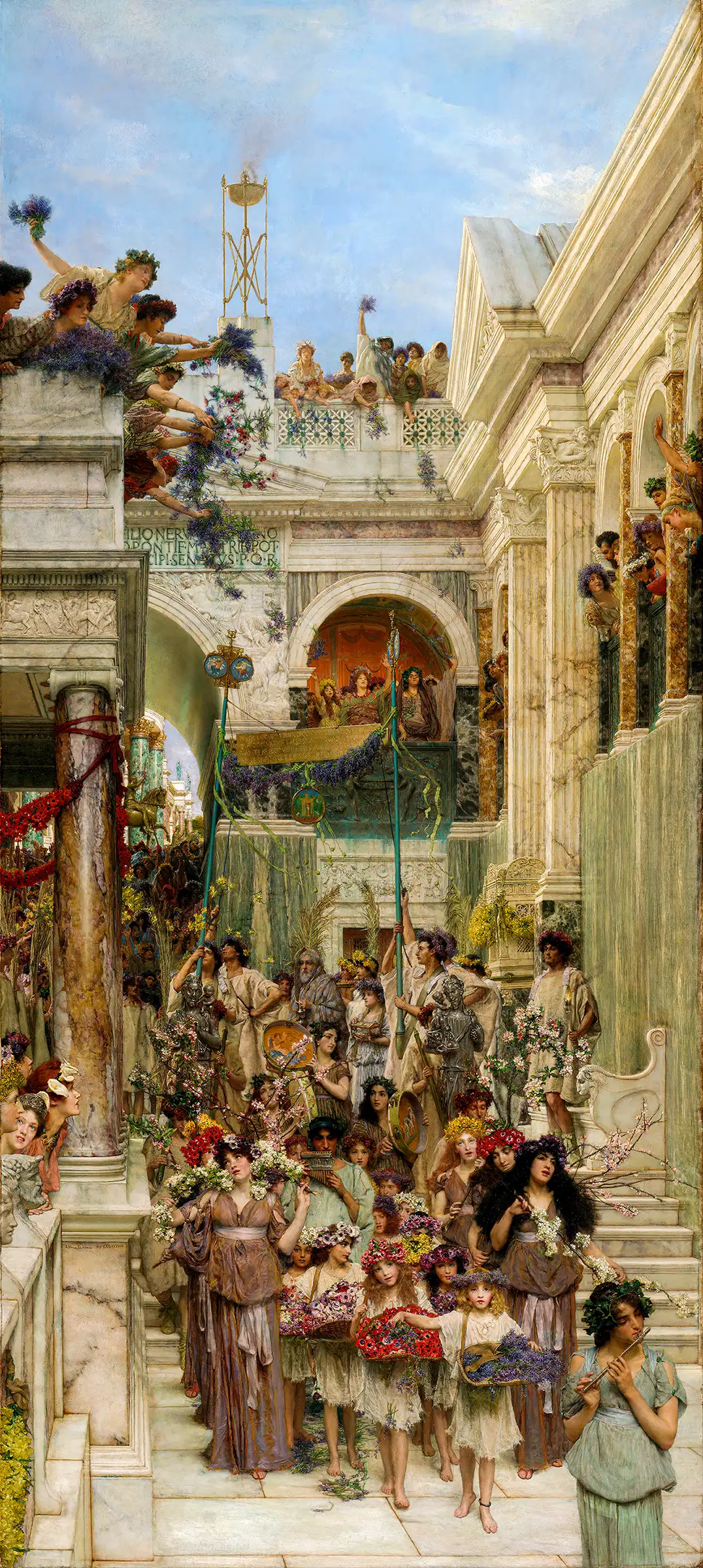 “The painting relates the Victorian custom of children collecting flowers on May Day back to an Ancient Roman spring festival, perhaps Cerealia or Floralia or Ambarvalia, although the details depicted in the painting do not correspond to any single Roman festival. It was the inspiration for the scene of Julius Caesar’s triumphal entry into Rome in the 1934 film Cleopatra.