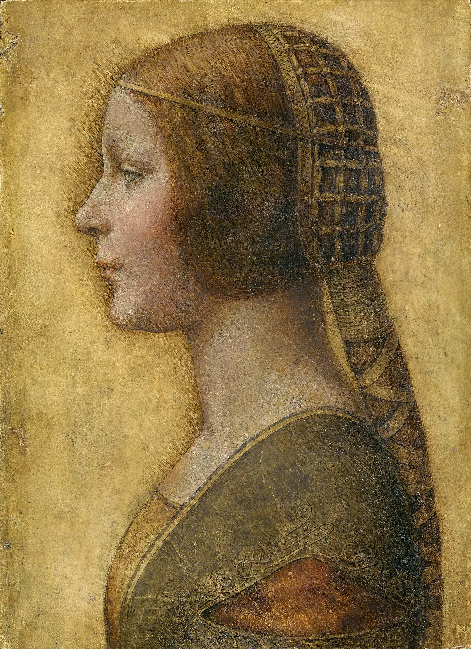 “La Bella Principessa (English: “The Beautiful Princess”), also known as Portrait of Bianca Sforza, Young Girl in Profile in Renaissance Dress and Portrait of a Young Fiancée, is a portrait in coloured chalks and ink, on vellum, of a young lady in fashionable costume and hairstyle of a Milanese of the 1490s. Some scholars have attributed it to Leonardo da Vinci, but the attribution and the work’s authenticity have been disputed. Supporters of the theory that it was by Leonardo have propositioned that Bianca Maria Sforza is the woman depicted in the drawing.