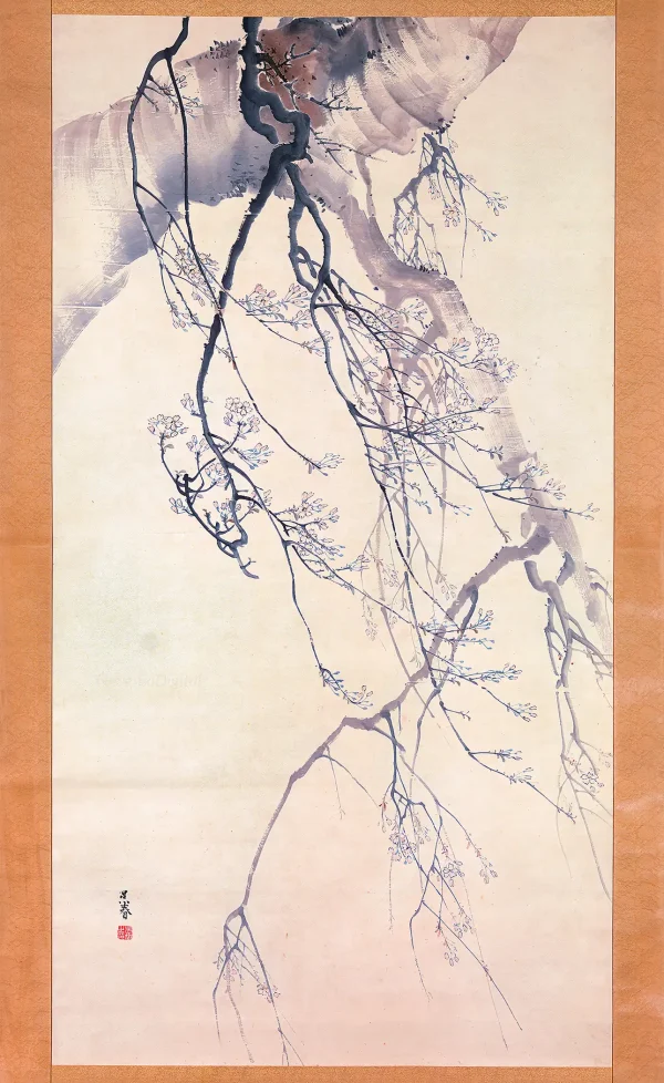 “Spring breezes suffuse the atmosphere of this realistic yet lyrical vision of fragile blossoms on the branch of an ancient cherry tree. One of the most familiar images in Japanese art, the blossoming cherry has deep roots in Japanese culture. Outings to view the short-lived blossoms were a long-established popular pastime, and this work poignantly captures the effect of a leisurely stroll beneath a cherry tree on a spring afternoon.