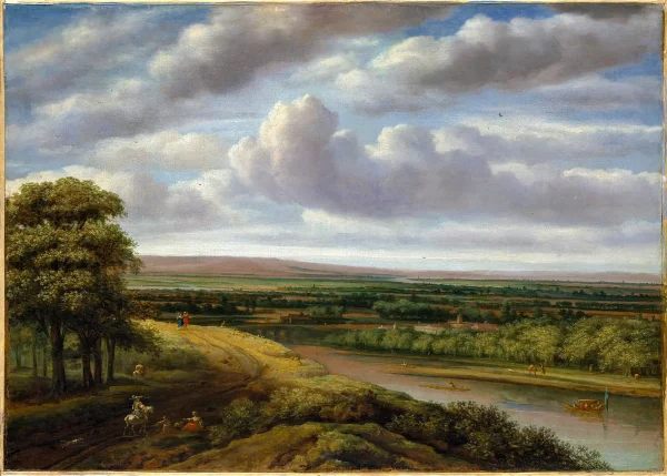A river landscape of 1676 in the Rijksmuseum, Amsterdam, is very similar in composition, and features the same elegant hunting boat, a jacht (yacht), to the right.”