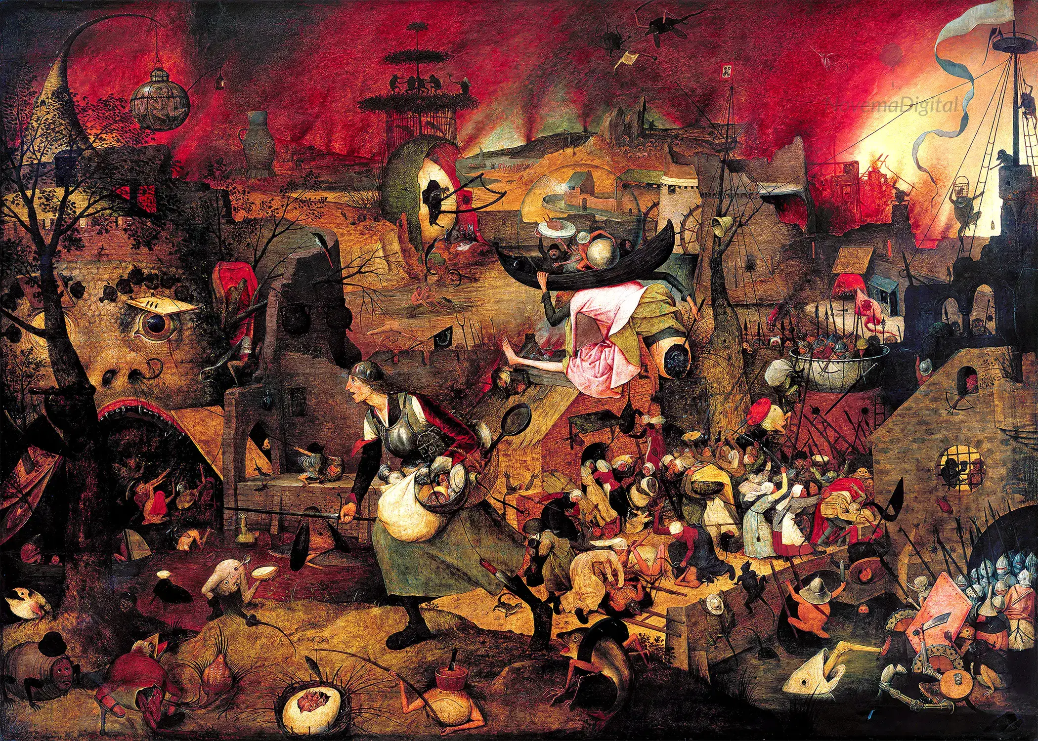 “Dulle Griet, also known as Mad Meg, is a figure of Flemish folklore – a virago, who leads an army of women to pillage Hell. Griet was a disparaging name given to any bad-tempered, shrewish woman. Her mission refers to the Flemish proverb: ‘She could plunder in front of hell and return unscathed’. Bruegel is thus making fun of noisy, aggressive women. At the same time, he castigates the sin of covetousness: although already burdened down with possessions, Griet and her grotesque companions are prepared to storm the mouth of Hell itself in their search for more.”