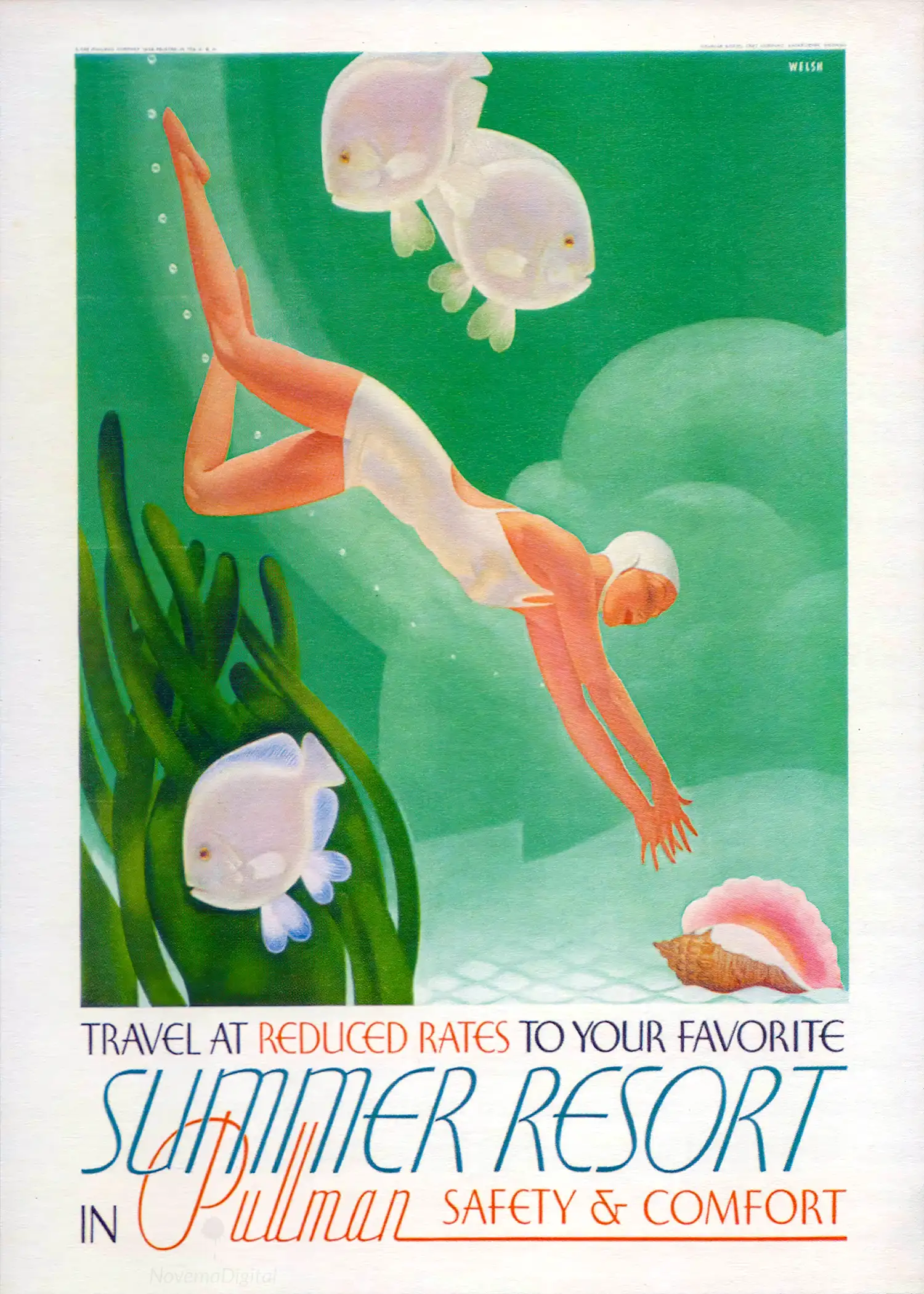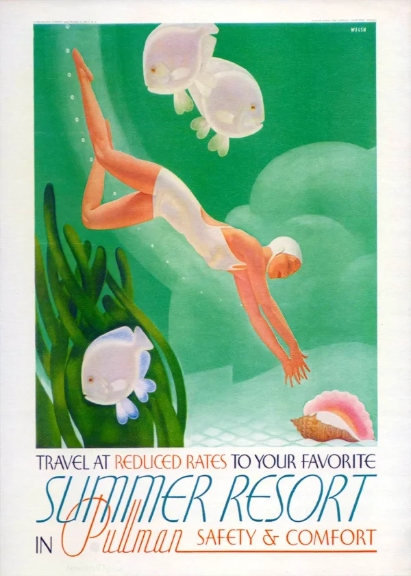 “Vintage poster promoting vacation resorts offered by the now-defunct Pullman railroad company.”