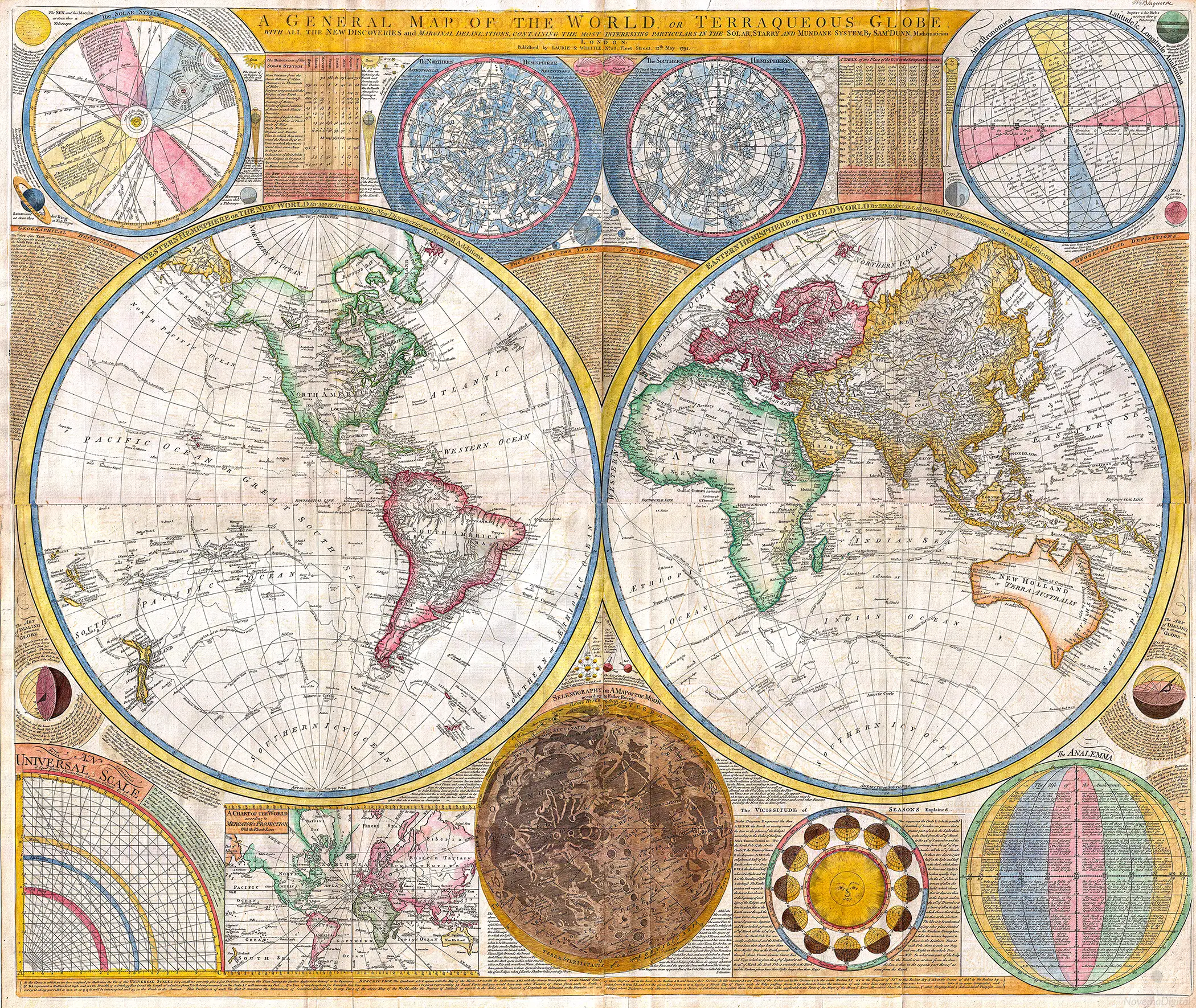 “An absolutely stunning and monumental double hemisphere wall map of the world by Samuel Dunn dating to 1794. This extraordinary map is so large and so rich in detail that it is exceptionally challenging to do it full justice in either photographic or textual descriptions. Covers the entire world in a double hemisphere projection. The primary map is surrounded on all sides but detailed scientific calculations and descriptions as well as northern and southern hemisphere star charts, a map of the Moon, a Latitude and Longitude Analemma chart, a map of the Solar System, a Mercator projection of the world, an Analemma projection, a seasonal chart, a universal scale chart, and numerous smaller diagrams depicting planets and mathematical systems.