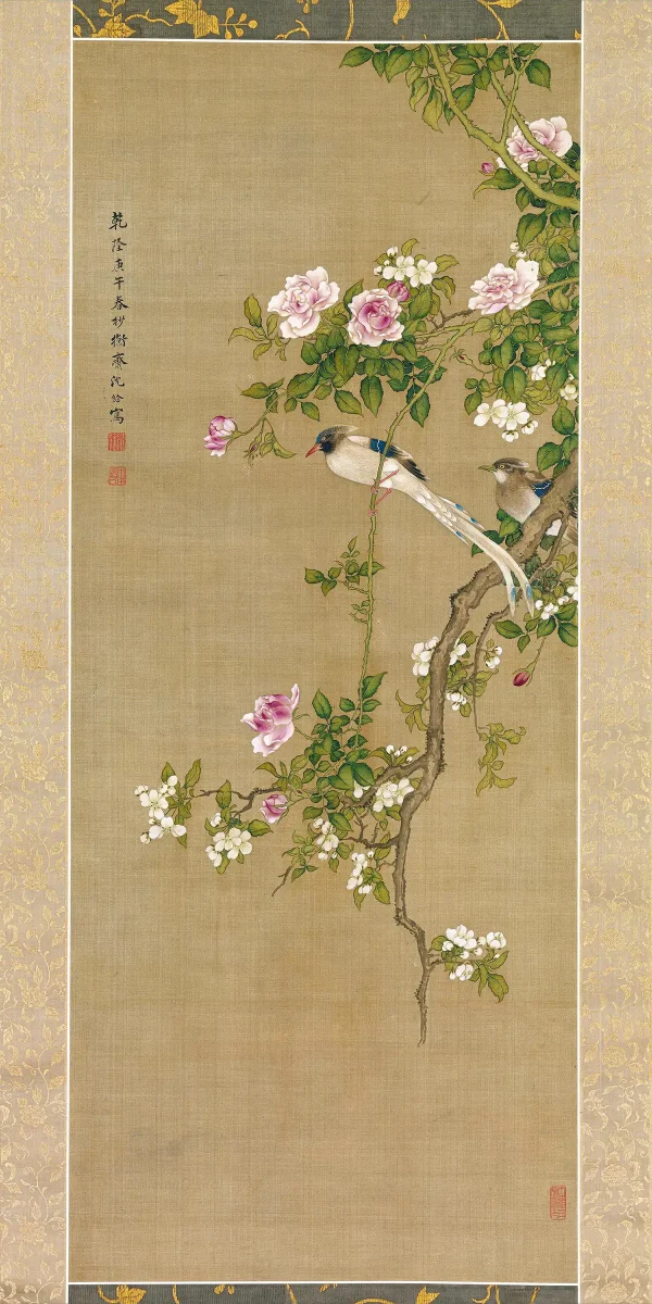 “This sumptuous painting evokes a rebus, or multipart visual pun, that transforms it from a decorative image into one laden with meaning. The two long-tailed birds (shoudai niao 綬帶鳥) symbolize “double longevity” (shuangshou 雙壽), while the rose (yueji 月季) and crabapple (haitang 海棠) stand for “high hall” (gaotang 高堂), a respectful term for one’s parents.