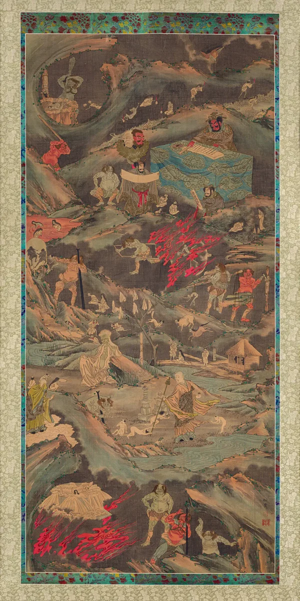 Elsewhere, demons march lost souls into a pool of molten lava. A scene in the bottom third of the picture shows a group of children in a graveyard, some attempting to escape from an approaching demon. Others beg for mercy from Jizō, who appears here as a monk. Another scene in an upper register of the painting shows individuals kneeling before the King of Hell, who sits at a large table. He is flanked by attendants that assess the various sins committed by the deceased in his or her previous life.”