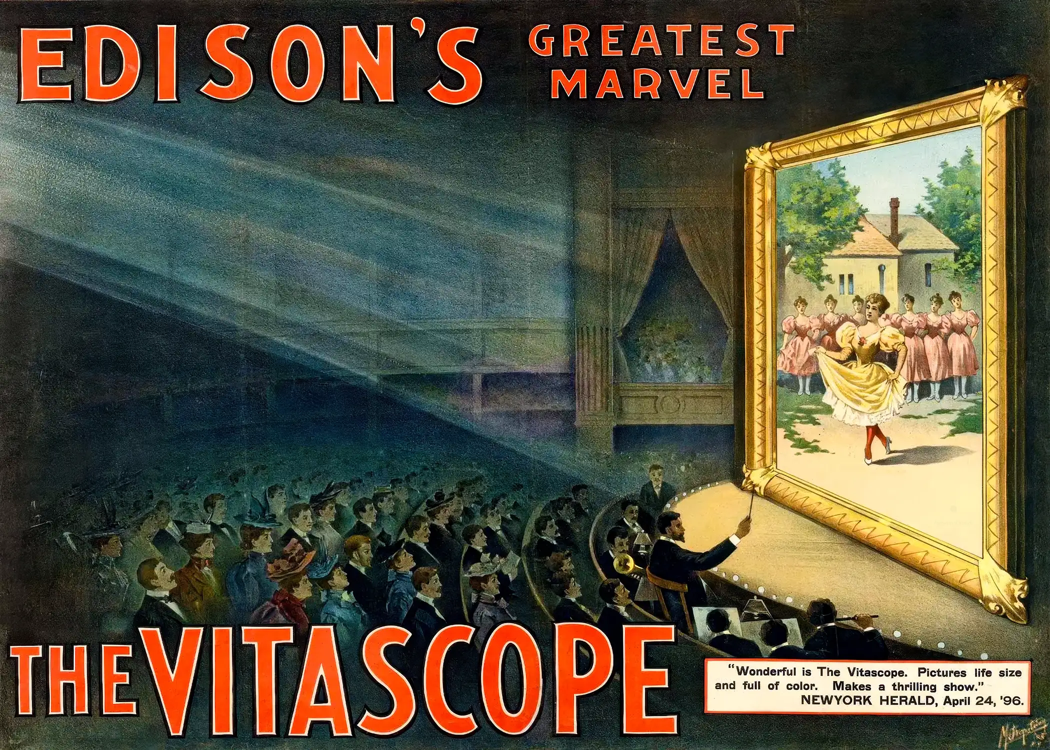 “Motion picture poster for “Edison’s greatest marvel–The Vitascope” show movie audience watching large screen with woman dancing on screen and others in background watching.”