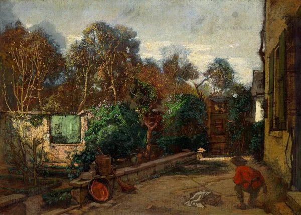 In the late 1840s, his hometown offered Couture the old bishop’s chapel as a studio; „The Bird-Catcher” depicts the courtyard of this building. In the foreground we see a young hunter, alert and tense, down on one knee, waiting for the right moment to pull the string of the trap. Around the birdman, we can see cages placed in the courtyard and hanging from the side of the building and from the trees, a reference to the young man’s trade.