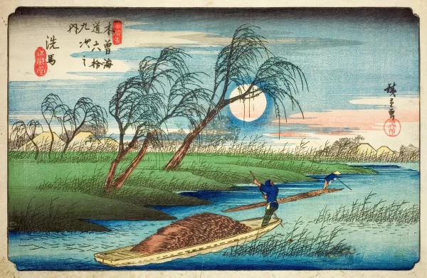 The common name for the Kisokaidō is “Nakasendō” so the series is sometimes referred to as the Sixty-nine Stations of the Nakasendō. It is a follow-up to Hiroshige’s The Fifty-three Stations of the Tōkaidō and he produced 47 of the prints, with Eisen being responsible for the rest.