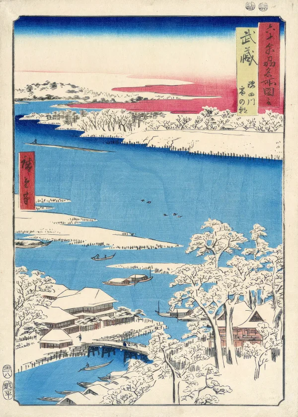 Utagawa Hiroshige – Snowy Morning on the Sumida River in Musashi Province (1853)