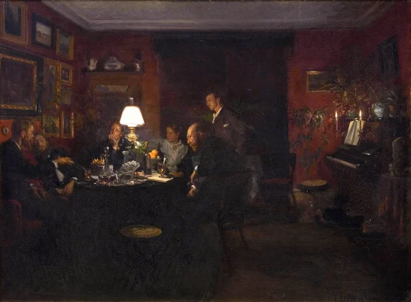 Nevertheless, Johansen is remembered particularly for the subdued lighting effects of his interiors — many of which were painted after his visit to Paris — as in his Glade jul (Merry Christmas, 1891), Aftenpassiar (Evening Talk, 1886) and Aftenselskab i kunstnerens hjem (Evening Gathering at the Artist’s Home, 1899) and his scenes of domestic family life, but he also painted landscapes (at Skagen, at Tisvilde, and at his childhood home, the fishing port of Dragør outside Copenhagen), still lifes and portraits.