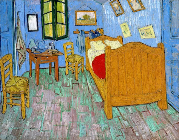 Van Gogh’s own title for this composition was simply The Bedroom (French: La Chambre à coucher). There are three authentic versions described in his letters, easily distinguishable from one another by the pictures on the wall to the right.