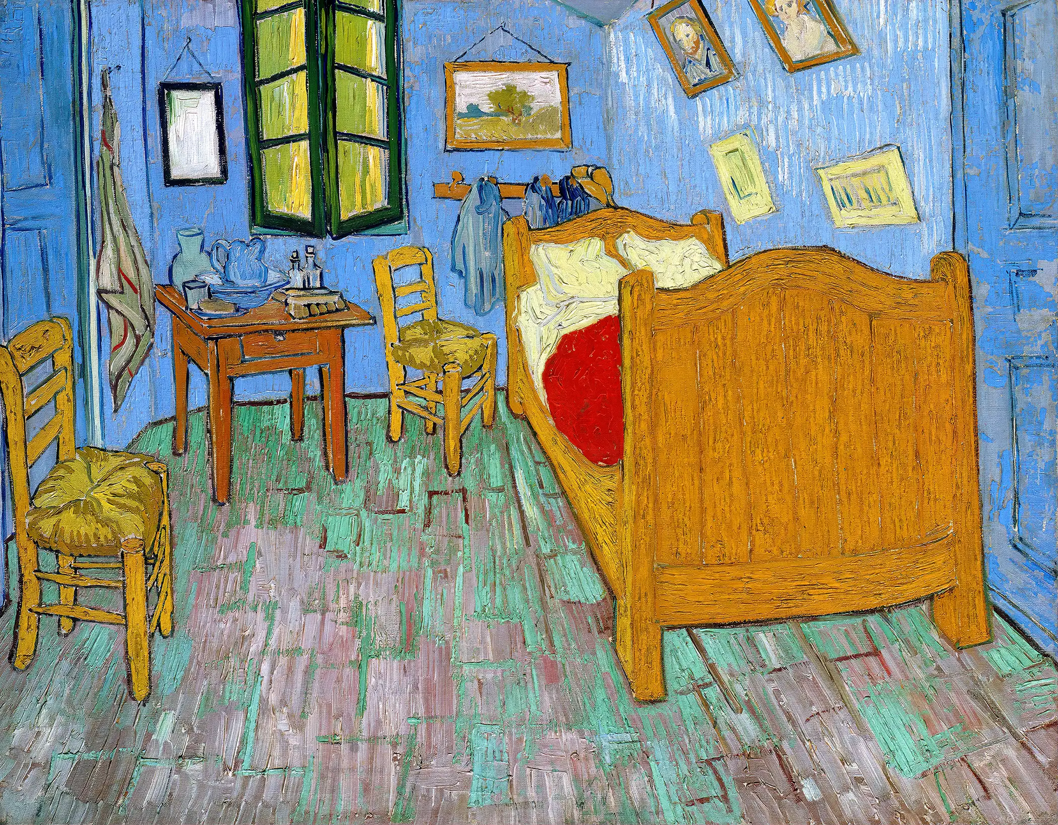 The painting depicts van Gogh’s bedroom at 2, Place Lamartine in Arles, Bouches-du-Rhône, France, known as the Yellow House. The door to the right opened on to the upper floor and the staircase; the door to the left was that of the guest room he held prepared for Gauguin; the window in the front wall looked on to Place Lamartine and its public gardens. This room was not rectangular but trapezoid with an obtuse angle in the left-hand corner of the front wall and an acute angle at the right.
