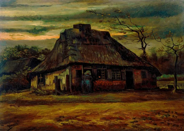 “The old cottage beneath the red evening sky presents an idyllic picture of rural life. Van Gogh called these humble farmhouses ‘people’s nests’. He felt they had a sheltering quality. This cottage contains two houses with two front doors and a shared chimney. That type of dwelling was then on the brink of disappearing. ‘The thing struck me greatly; those two cottages, half decayed under one and the same thatched roof, reminded me of a couple of worn-out old folk who make up just one single being and whom one sees supporting each other,’ he wrote.