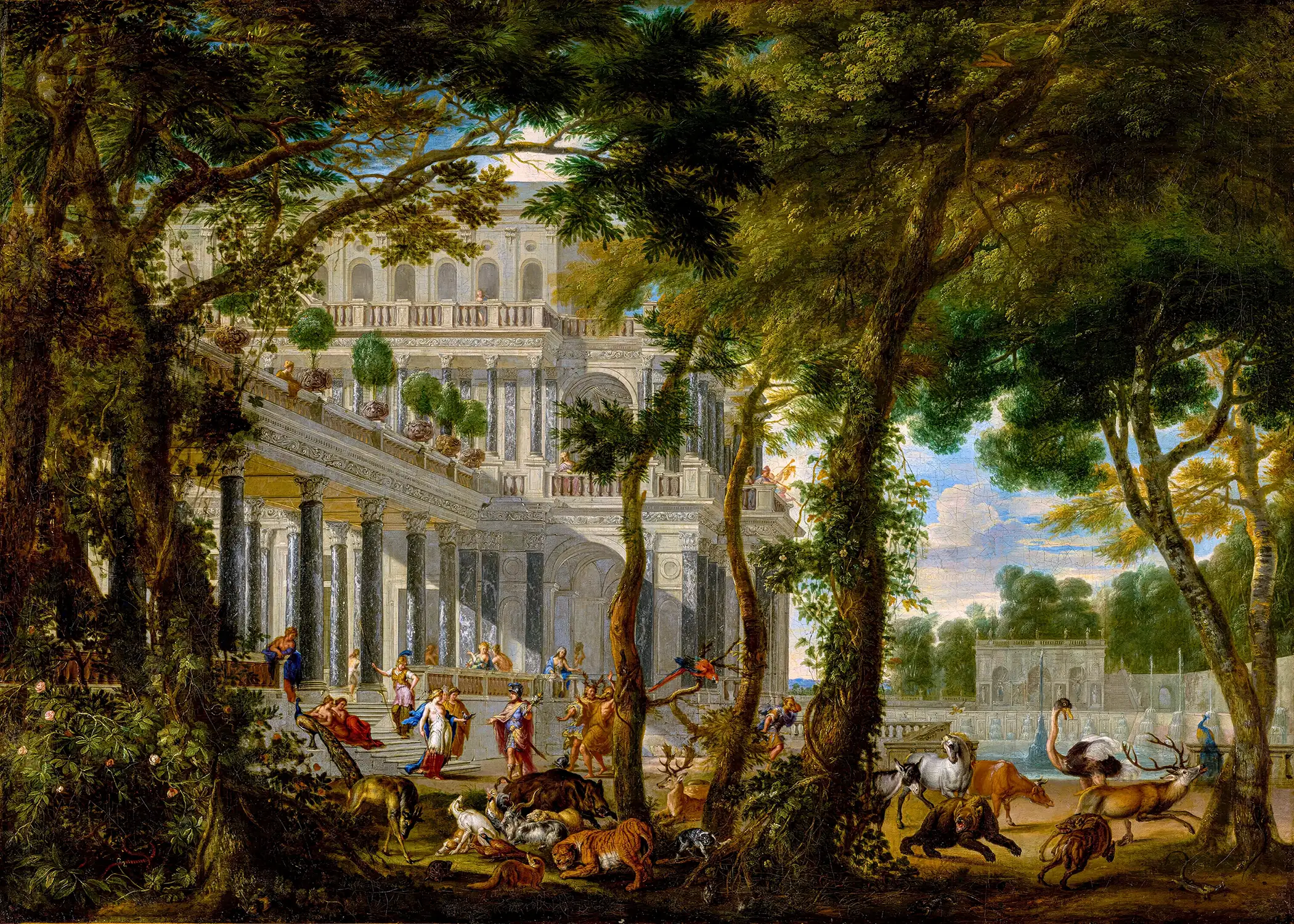 The tiny figures of Ulysses, Circe, and her entourage are secondary to the magnificently decorated palace, the lush landscape, and the assortment of lively animals. The painting is a collaborative effort of two painters: the Flemish artist Wilhelm Schubert van Ehrenberg, a specialist in depicting architecture, painted the palace and garden house, while the German artist Carl Borromäus Andreas Ruthart was responsible for the naturalistic display of animals in the foreground.”