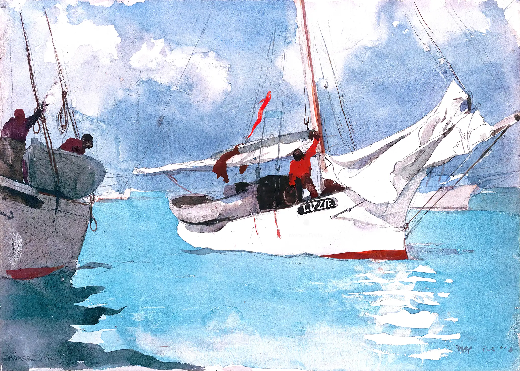 “Although Homer’s title identifies this watercolor as Key West, Florida, it appears to show typical Bahamian fishing boats. From the seventeenth century, Bahamians had frequently traveled back and forth to Florida, and Key West is only about 280 miles west of Nassau, across the Gulf Stream. Following the U.S. Civil War, many Black Bahamians migrated to Key West, where they found familiar work (including turtling and salvaging).