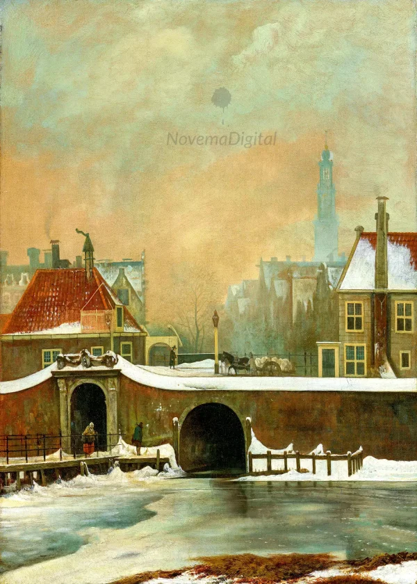 “The 18th-century Raampoortje was part of Amsterdam’s city rampart near the Bloemgracht. The small gate gave access to the bleaching fields outside the city wall, where dyed cloth was laid out to dry on wooden frames, from which the Raampoortje (Frame Gate) got its name. Here we look from the bleaching fields past the houses on the Bloemgracht towards the cold and wintry city. The Westertoren rises in the distance. The gate was demolished in 1846.”