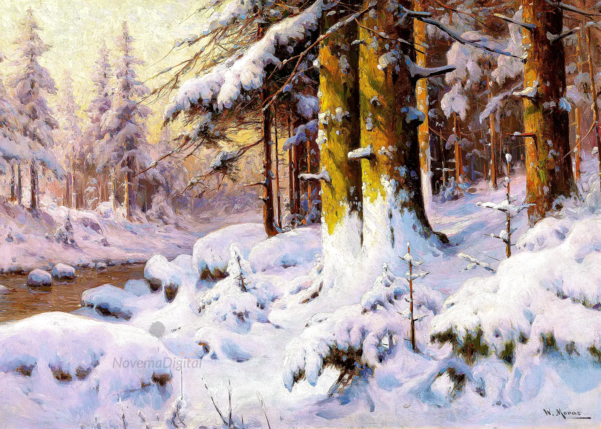 “Walter Moras was a German landscape painter. Best known for his depictions of rural scenes and winter forests, Moras employed a realist technique while simplifying forms and detail so as to soften the overall effect of his images. Born on January 20, 1856 in Berlin, Germany, Moras went on to study with the painter Hermann Eschke, who specialized in landscape and maritime scenes. He primarily made his work in Brandenburg, which is located on the outskirts of Berlin, though he also made several painting trips to the Netherlands and Italy. He started exhibiting when he was 20 years old, and continued to show work throughout his life. Today, Moras’ paintings can be found mostly in collections in Germany, including the Nationalgalerie Berlin, the Kunstforum Ostdeutsche Galerie in Regensburg, and the Kulturhistoriches Museum Magdenburg. He died on March 6, 1925 in Harzburg, Germany.”