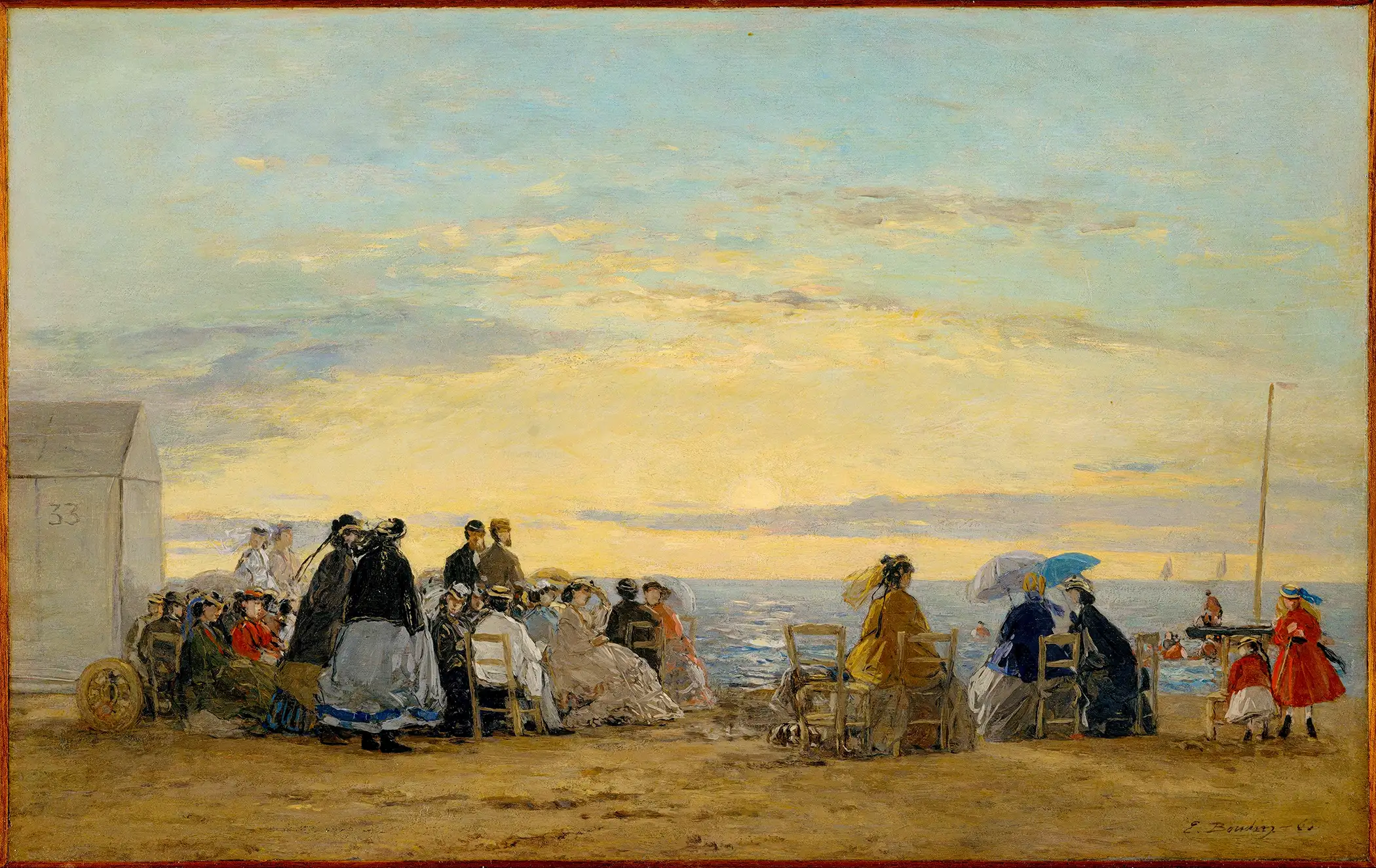“Boudin’s masterful and convincing representation of light effects, such as the sunset in this picture of 1865, profoundly influenced the young Claude Monet. The two artists worked together on the Normandy coast the previous summer.”